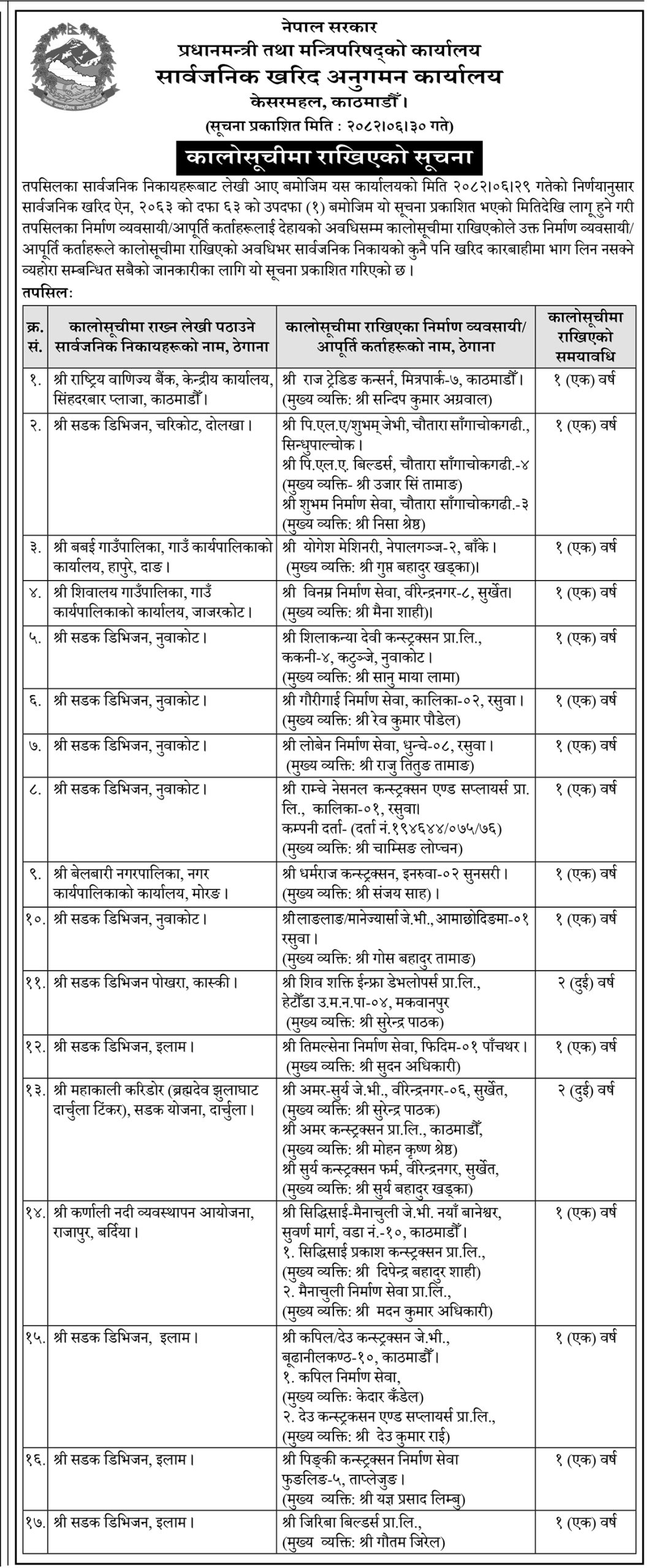 कार्यालयले आज जारी गरेको सूचनामा अनुसार, तीन कम्पनीलाई दुई वर्षका लागि र बाँकी १९ कम्पनीलाई एक वर्षका लागि कालोसूचीमा राखिएको छ।