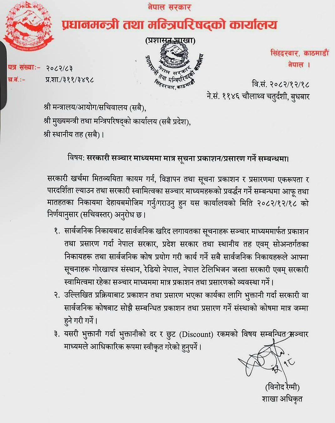 अब सबै सार्वजनिक निकायहरूले आफ्ना सूचना गोरखापत्र संस्थान, रेडियो नेपाल र नेपाल टेलिभिजनजस्ता सरकारी सञ्चार माध्यममार्फत मात्र प्रकाशन तथा प्रसारण गर्नुपर्ने व्यवस्था गरिएको छ।